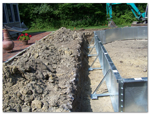 Step 4.Pouring of the concrete bond beam and pool floor. The bond beam surrounds the outside of the pool walls and the braces, and holds everything in place, nice and tight. The pool floor is poured precisely so that the liner will fit like a glove.